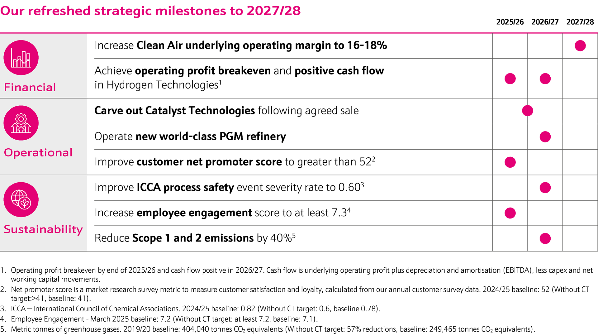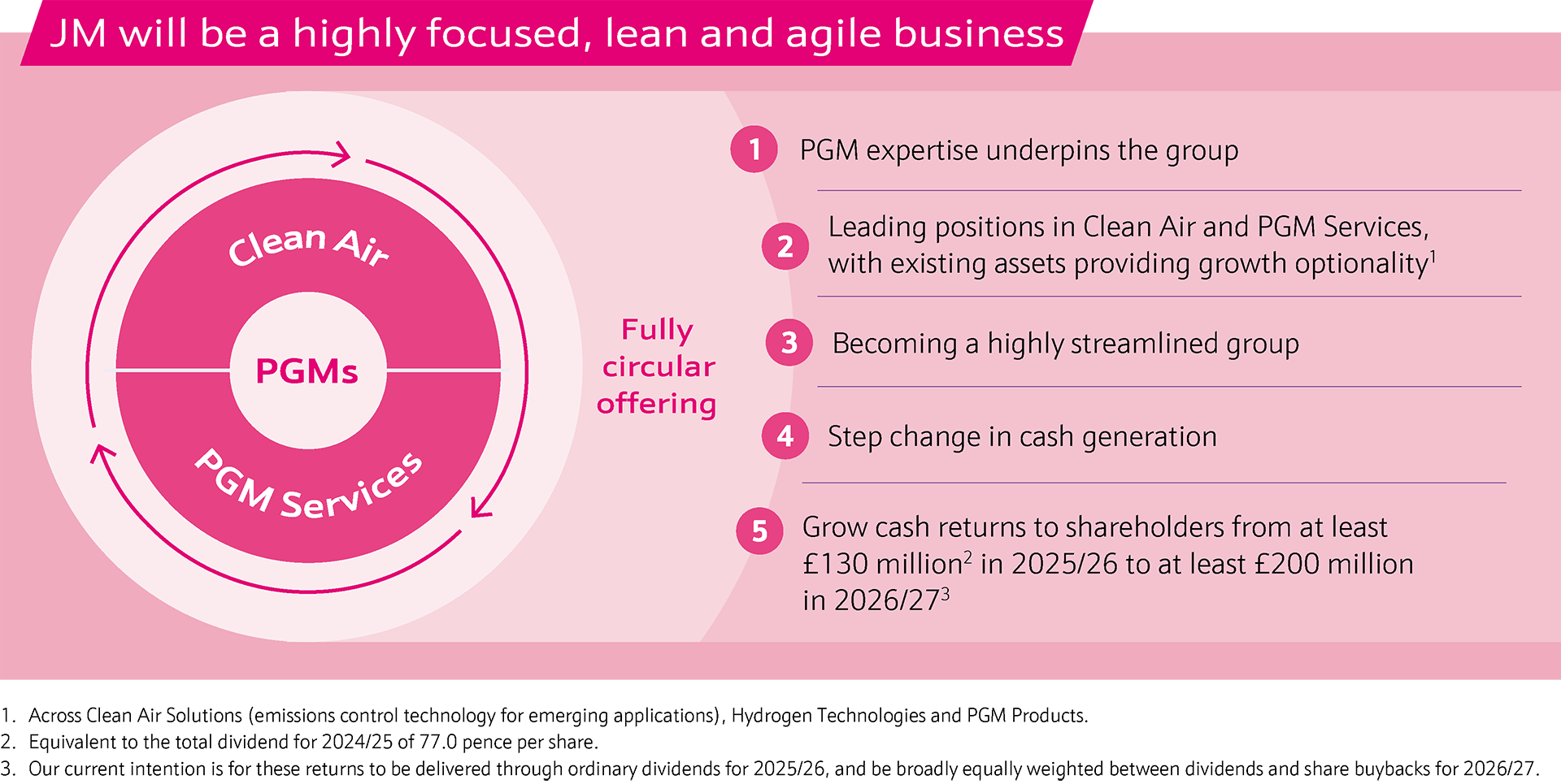 In May 2025 we announced the agreement to sell our Catalyst Technologies business. Following the sale, JM will be a highly focused, lean and agile business, centred around Clean Air (including hydrogen technologies) and PGM Services. These businesses have leading market positions, underpinned by our strong heritage in platinum group metals (PGMs), combined with a circular business model based on our world-class refining capabilities and our ability to manage PGMs for our customers.