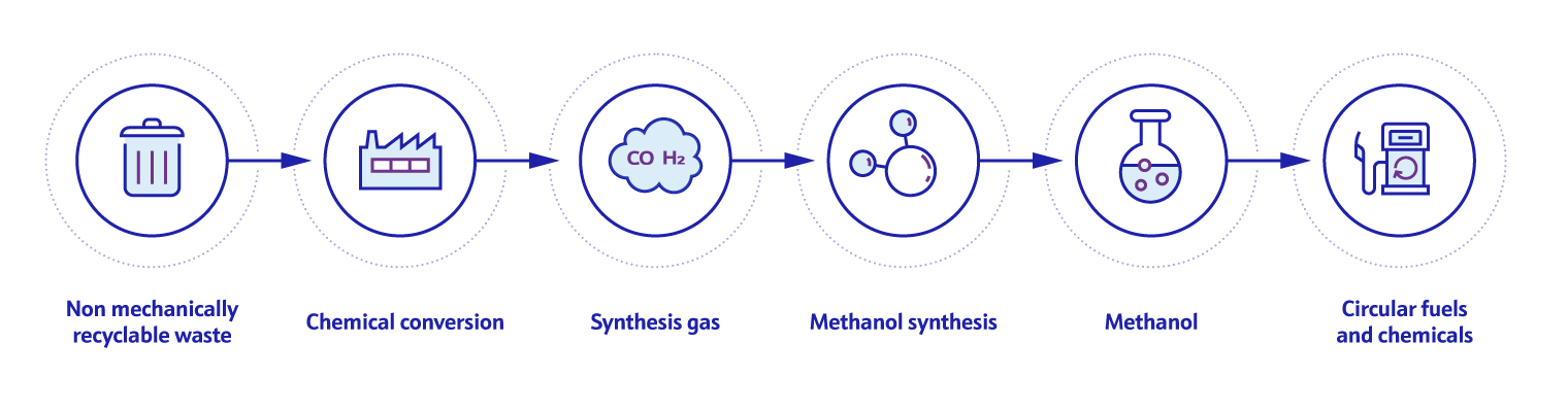 Waste is a source of valuable carbon and hydrogen that can be transformed into methanol. This reduces the amount of waste destined to landfill and incineration and replaces natural gas and coal-based feedstocks, enabling the production of more sustainable fuels and chemicals with a lower carbon footprint.