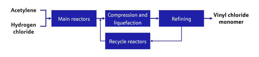 Our solution produces VCM from acetylene and hydrogen chloride in an anhydrous process which uses both main and recycle reactors. The bulk of the reaction is carried out by the main reactors, while the recycle reactors help the transformation of un-converted feedstocks into product. This feature of our VCM production process enables every reactor to operate at a high reaction rate, with less catalyst and without the need for full conversion.