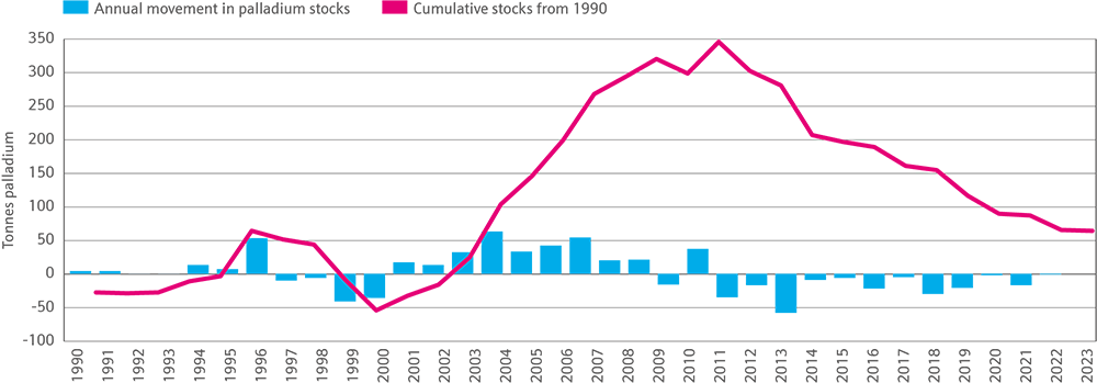 Traditionally, producer and market stocks of platinum and palladium have been held in ingot form in either London or Zurich. Although the precise amount of these stocks is unknown it is possible to track the flow of platinum and palladium into and out of these locations.