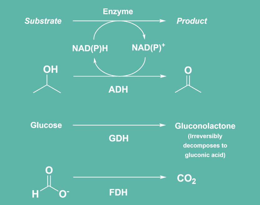 Many enzymes used as biocatalysts require NAD(P)+ to facilitate oxidation-reduction reactions. To be able to use this cofactor in catalytic amounts, the oxidised cofactor must be continuously reduced, this is called cofactor regeneration. The enzymes accept either or both NAD(P)+ cofactors and their regeneration can be achieved by adding a cofactor regeneration enzyme (GDH, FDH, or ADH), and its substrate (D-glucose, sodium formate, or isopropanol).