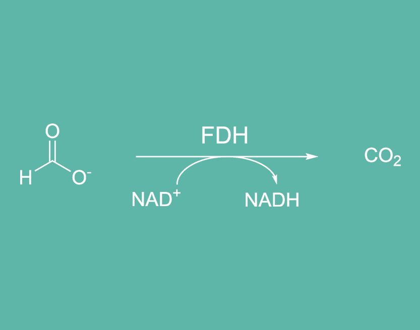 Formate dehydrogenase (FDH enzyme) oxidises formate to carbon dioxide while reducing in turn NAD+ to NADH. Carbon dioxide leaves the reaction media as a gaseous molecule, favouring NADH cofactor regeneration. FDH enzymes can be engineered to achieve the optimal activity and selectivity of your application.