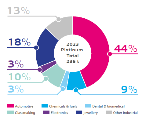 Platinum jewellery currently accounts for almost a quarter of platinum demand, but the largest use of platinum is in automotive catalytic converters. Platinum plays an important role as a catalyst to reduce exhaust emissions, required in both diesel-fuelled and gasoline-fuelled vehicles.