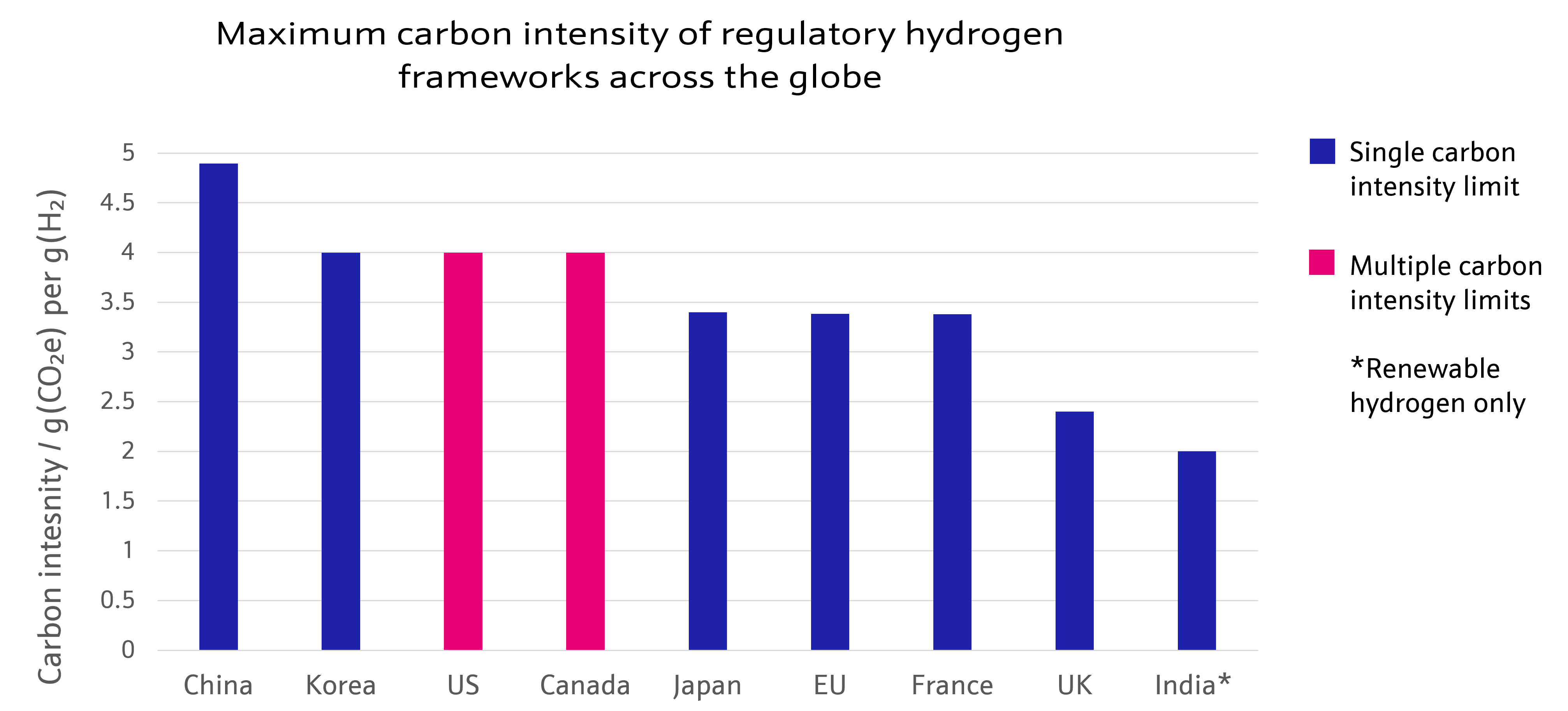 The UK was one of the first countries to publish a hydrogen standard with clear methodology in the spring of 2022. The UK Low Carbon Hydrogen Standard is independent of feedstock but with the lowest carbon intensity limit of similar regulatory standards under development. Under this leading standard, both renewable hydrogen projects and those producing hydrogen from natural gas with carbon capture (CCS-enabled hydrogen) are eligible for support. For example, bp’s HyGreen Teesside and H2Teesside projects.
